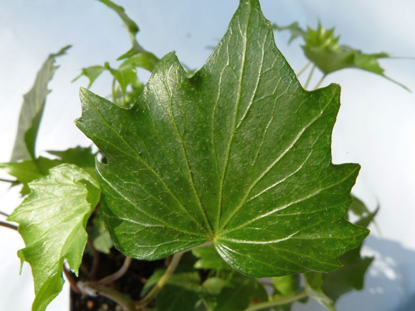 The leaf is 6-7 cm in size with a sublime distinctive veining. It is composed of 5 to 7 pointed lobes that overlap and undulate at the sinuses. The blade is medium to dark green. The stems are reddish green, the internodes short.